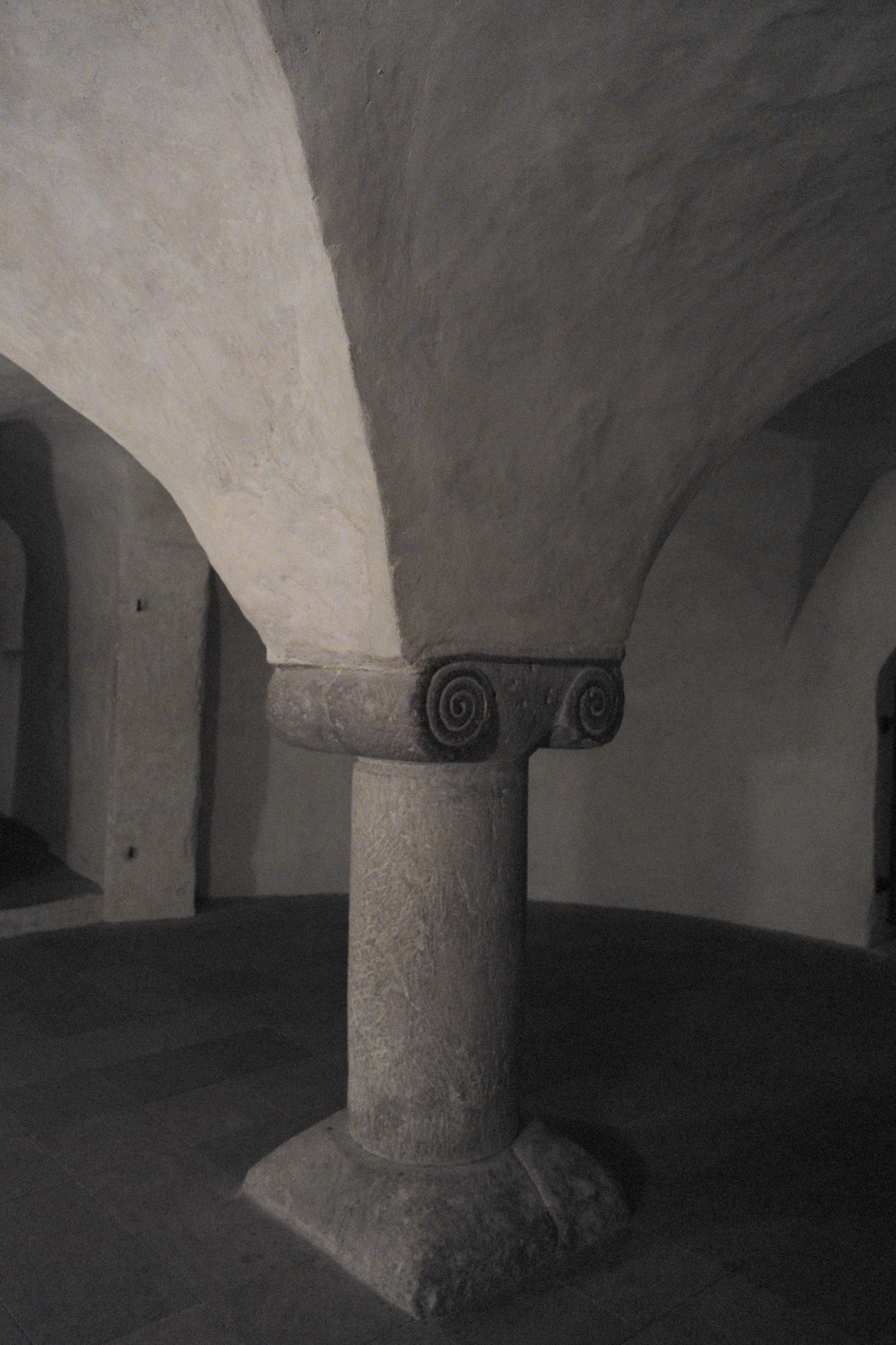 Tatsächlich hat die unterirdische weder über einen Altar noch über eine räumliche Verbindung zum Obergeschoss verfügende Krypta die Zerstörungen des Ungarneinfalls unbeschadet überstanden. Für das archaisch anmutende ionisierende Kapitell der Mittelsäule in der Krypta (s. Abb. 13) wird sekundäre Verwendung angenommen.