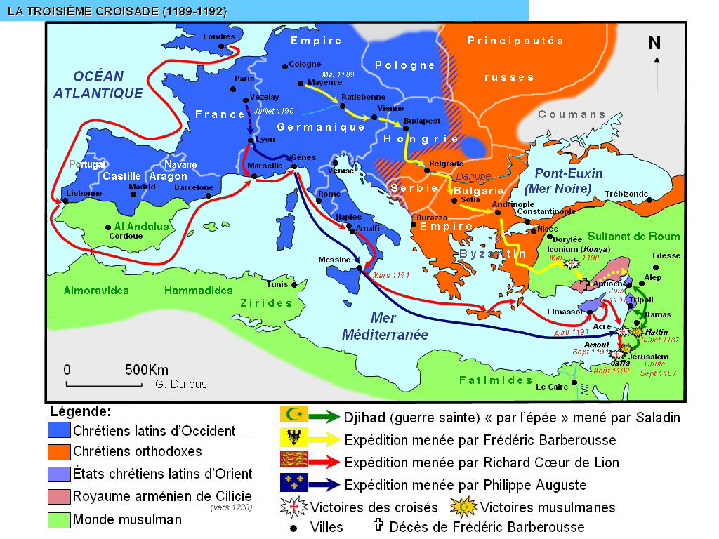 Doch keine einhundert Jahre später musste Jerusalem im Herbst 1187 nach einer Belagerung durch die Truppen Saladins, des Begründers der Ayyubiden-Dynastie, erneut einen, wenn auch weitaus unblutigeren Wechsel der Herrschaft hinnehmen. Das Pendel hatte zurückgeschlagen, diesmal im Sinne des Islam. Womit der unmittelbare Anlass für den nunmehr 3. Kreuzzug (s. Abb. 1) gegeben war. Ein gewaltiger Heereszug – an seiner Spitze der aus dem Geschlecht der Staufer stammende Kaiser des Heiligen Römischen Reiches Friedrich I. Barbarossa – wählte den Landweg über den Balkan und durch Kleinasien. Doch noch vor Erreichen des Heiligen Landes ertrank der charismatische Barbaossa im Juni 1190 im Fluss Saleph.