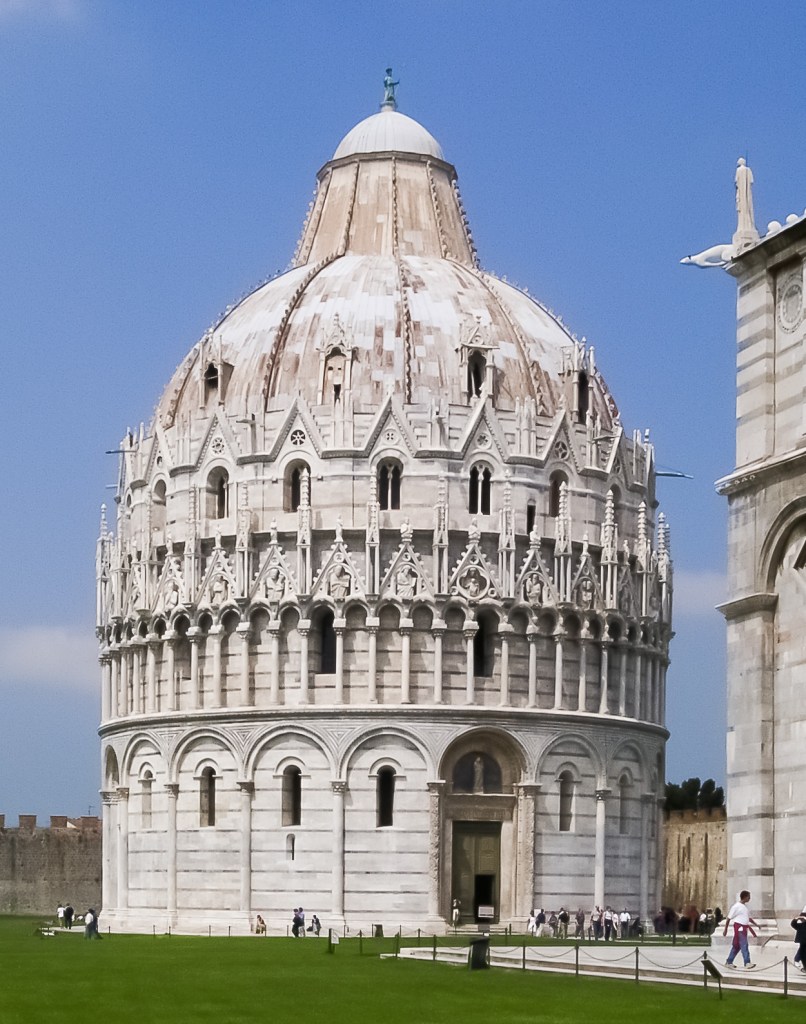 Rund 90 Jahre nach Beginn der Arbeiten am Dom machten sich die Pisaner 1152 an die Errichtung der mit 54 Meter Höhe und 107 Meter Umfang größten Taufkirche der christlichen Religionsgemeinschaft. Die Kuppel konnte erst 1394 fertiggestellt werden, so dass einschließlich aller Unterbrechungen von einer Gesamtbauzeit von 240 Jahren auszugehen ist. Der Typus des zentralen Rundbaus, wie er während der Renaissance in der Rotunde von St. Peter seine monumentalste und noch in der Gegenwart vielbewunderte Realisierung finden sollte, findet im Pisaner Baptisterium ein frühes stilistisch der Protorenaissance zuzuordnendes anregendes Muster, dessen Architekten selbst weder bei der Planung des Grundrisses Anleihen beim Pantheon (s. Abb. 12, 19, 20) noch bei der Gestaltung des Aufrisses Kenntnis des spätantiken Vorbilds von San Vitale (s. Abb. 9, 21) verneint haben würden.