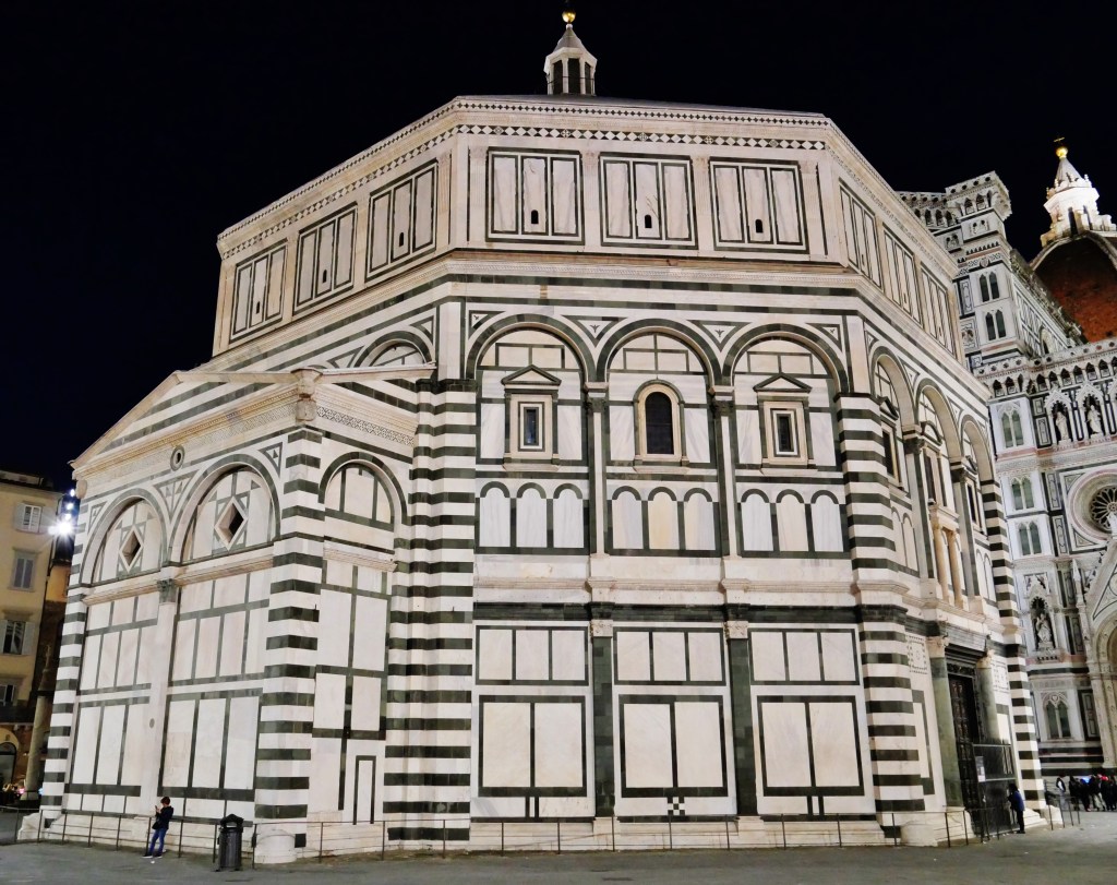 Gleich mehrere kunst- und baugeschichtlich hochbedeutsame ebenfalls toskanische Bauwerke, die der als Proto- oder Vorrenaissance bezeichneten Stilepoche zugerechnet werden, rücken in den Fokus, sofern man Pisa in östlicher Richtung verlässt. Den Arno aufwärts, nur rund 70 Kilometer Luftlinie entfernt, begegnen uns in Florenz mit den Kirchen San Miniato al Monte (s. Abb. 1, 2, 6) und Santi Apostoli (s. Abb. 7, 8) sowie dem Baptisterium San Giovanni (s. Abb. 10, 11) gleich drei Beispiele der Sakralarchitektur die, obschon von der Zeitstellung her noch nicht der eigentlichen Renaissance zugehörig, einige ihrer Wesensmerkmale vorwegnehmen, antizipieren. Aus diesem Grund werden sie von manchen Experten – aufbauend auf den im 19. Jahrhundert gewonnenen Erkenntnissen des Schweizer Kulturhistorikers Jacob Burckhardt – stilistisch nicht direkt, wie eigentlich klar zu erwarten wäre, der Romanik, sondern der in ihrer geographischen Verbreitung stark eingegrenzt auftretenden, eine ihrer regionalen Sonderformen markierenden sogenannten Proto- oder Vorrenaissance zugeordnet. Um einem aufgrund dieser These lauernden gravierenden Missverständnis vorzubeugen: Die Romanik selbst mit der ihr eigenen allseits geläufigen Vorliebe und Wertschätzung für Rundbögen, Säulen und bereits aus der römischen Architektur bekannten Bauformen wie der sich ursprünglich aus einer Gerichts- und Markthalle zur frühchristlichen Kirche entwickelnden Basilika ist schon ein antikisierender Stil gewesen. Die Proto- oder Vorrenaissance dürfen wir hingegen als alle genannten Einzelelemente aufnehmende, jedoch die der Romanik typischerweise innewohnende Schlichtheit verlassende und in künstlerischer Prachtentfaltung schwelgende Steigerung derselben, als spezifischen Gemeinsamkeiten verpflichtete Ästhetisierung des gebauten Raumes begreifen.