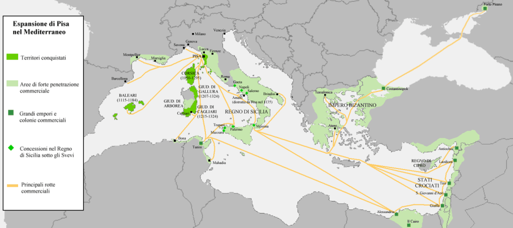 Dabei waren die Verhältnisse ursprünglich gänzlich anders gelagert. Denn Pisas Bedeutung aufgrund der gegebenen maritimen Potenz übertraf zunächst diejenige von Florenz bei weitem. Der Einfluss erstreckte sich sogar auf die großen Inseln des Tyrrhenischen Meeres (Korsika 1050 – 1295, Balearen 1115 – 1184, Teile Sardiniens 1207 – 1324). Die Seerepublik verfügte über Handelsstützpunkte (s. Abb. 14) in vielen größeren Küstenstädten des westlichen und östlichen Mittelmeerraumes (Salerno, Neapel, Messina, Palermo, Tunis, Alexandria, Tyros, Akkon, Konstantinopel und andere mehr). War dementsprechend vielfältiger kultureller Einflussnahme ausgesetzt.