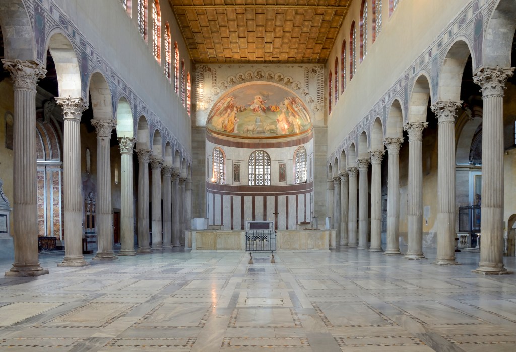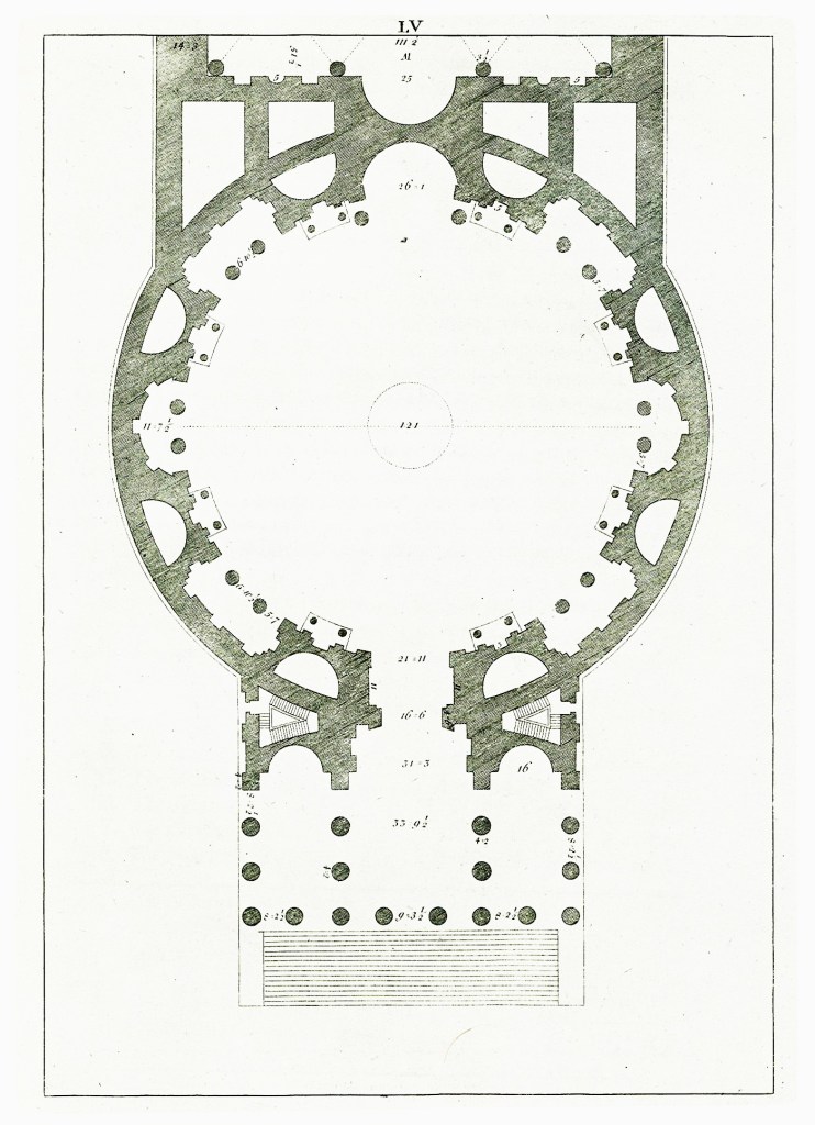 Entstanden ist eine kreuzförmige, wiederum dem Typus der Säulenbasilika folgende Anlage mit fünfschiffigem Langhaus, das unmittelbar jenseits der als dreischiffige Emporenbasiliken gestalteten Querhausarme und dem anschließenden Chor in eine Apsis einmündet. Über der ein Rechteck und kein Quadrat bildenden Vierung, das heißt des Raumes der beim Zusammentreffen von Haupt- und Querschiff entstanden ist, erhebt sich eine erst 1380 nach mehr als dreihundert Jahren Gesamtbauzeit hinzugefügte elliptische Kuppel.
