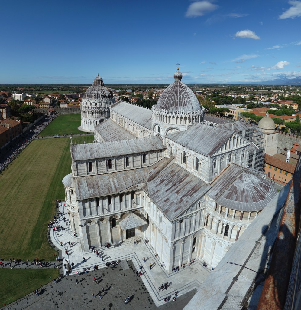 15. Blick vom Campanile auf die den östlichen Abschluss der Cattedrale di Santa Maria Assunta bildende Apsis und den Schnittpunkt zwischen südlichem Querhausarm und Chor. Die Fassade des Untergeschosses ist mit Blendarkaden versehen, während die darüber befindlichen Stockwerke der Apsis außen mit umlaufenden Zwerggalerien verziert sind.