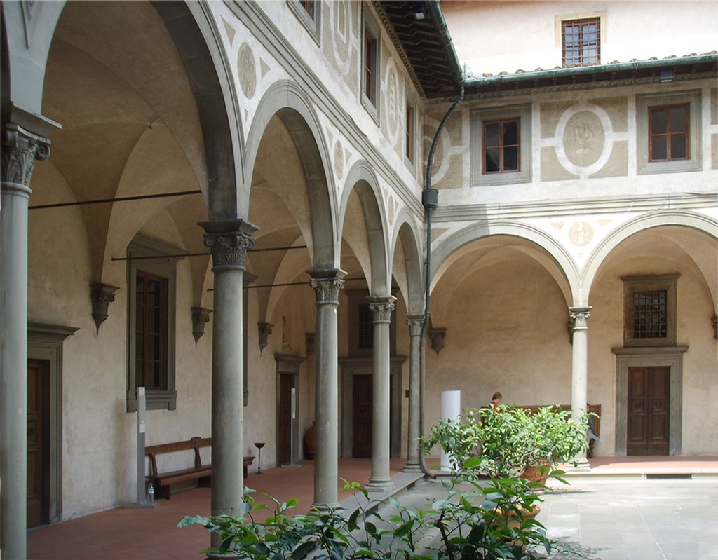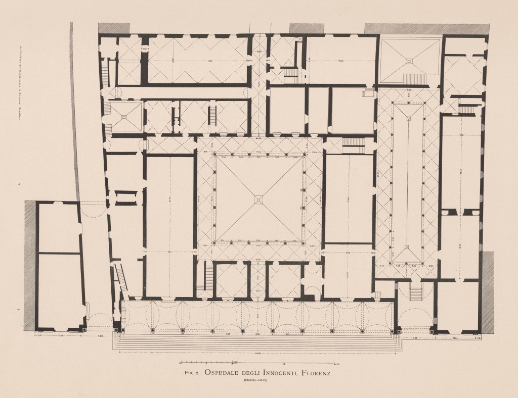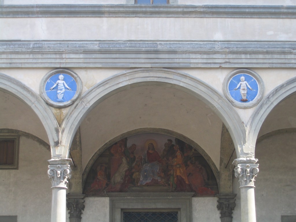 Als eines der ersten zwischen 1419 und 1445 realisierten Bauwerke, in denen gegenüber der sonst in Europa seinerzeit bevorzugt anzutreffenden Gotik mit ihrer Vorliebe für Kreuzrippengewölbe, Spitz- und Strebebögen ein gänzlich neuartiges Bewusstsein zum Ausdruck gekommen ist, gilt das unter bauplanerischer Federführung Brunelleschis (s. o.) entstandene Ospedale degli Innocenti in Florenz. Eine soziale Einrichtung für Waisen und Findelkinder mithin, deren Hauptanliegen darin bestand, gerade den jüngsten und schwächsten Bewohnern des Ortes eine vorübergehende Heimstatt und Bleibe zu gewähren. In einer Stadt mit damals schon über 50.000 Einwohnern, einem der zehn bevölkerungsreichsten Orte des Kontinents, war das Wohlstandsgefälle zwischen reichen Bankiers und darbenden Tagelöhnern am anderen Ende der sozialen Hierarchie naturgemäß beträchtlich. Die Not vielfach mit Händen zu greifen.