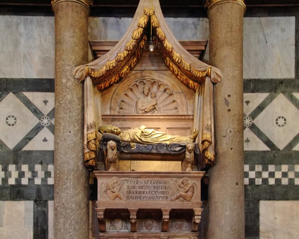 Mittendrin Giovanni di Bicci de‘ Medici (s. Abb. 2). Ob es tatsächlich auf seine persönliche materielle Unterstützung zurückzuführen war, dass ein neapolitanischer Priester namens Baldassare Cossa im Jahr 1402 die Kardinalswürde erlangt hat, lässt sich nicht mit letzter Gewissheit bestätigen. Unbestritten ist hingegen die Ansprache des Bankiers in mehreren Briefen Cossas als „mein teuerster Freund“. 1410 zur Zeit des Abendländischen Schismas (s. o.) wurde Cossa als Johannes XXIII. zum Papst gewählt. Einer von mehreren. Zum Depositar der apostolischen Kammer, ergo zum Verwalter des päpstlichen Vermögens, wurde der Direktor der römischen Filiale der Medici-Bank ernannt. Was im Ergebnis bedeutete, dass man Johannes XXIII. Geld für die Kriegsführung gegen Neapel und noch höhere Beträge für Reparationen lieh, als schließlich besagter militärischer Konflikt verloren war. Sofern es in jenen Jahren um die Ernennung von Bischöfen ging, übernahm die Bank gerne das Vorschlagsrecht, um dann bei Amtsantritt eines derartigen hohen geistlichen Würdenträgers das dafür fällige Honorar einzustreichen. Auf der Vorschlagsliste für geeignete Kandidaten fanden sich dementsprechend nur finanzkräftige, zahlungswillige Personen ein. Kompetenz und persönliche Glaubenstiefe gerieten eher in den Hintergrund.
